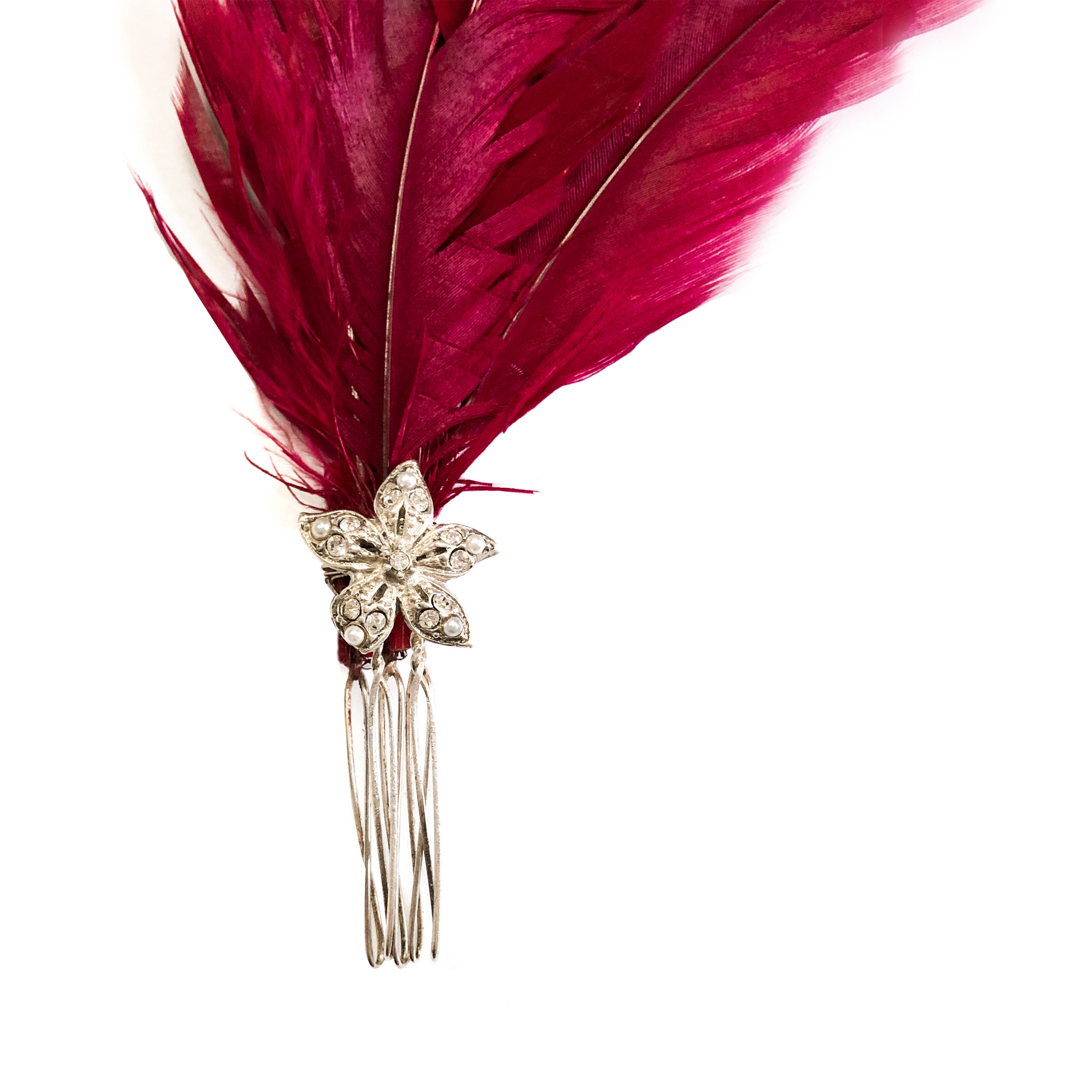 Pente com banho de prata, cristal e penas vermelhas – tamanho único