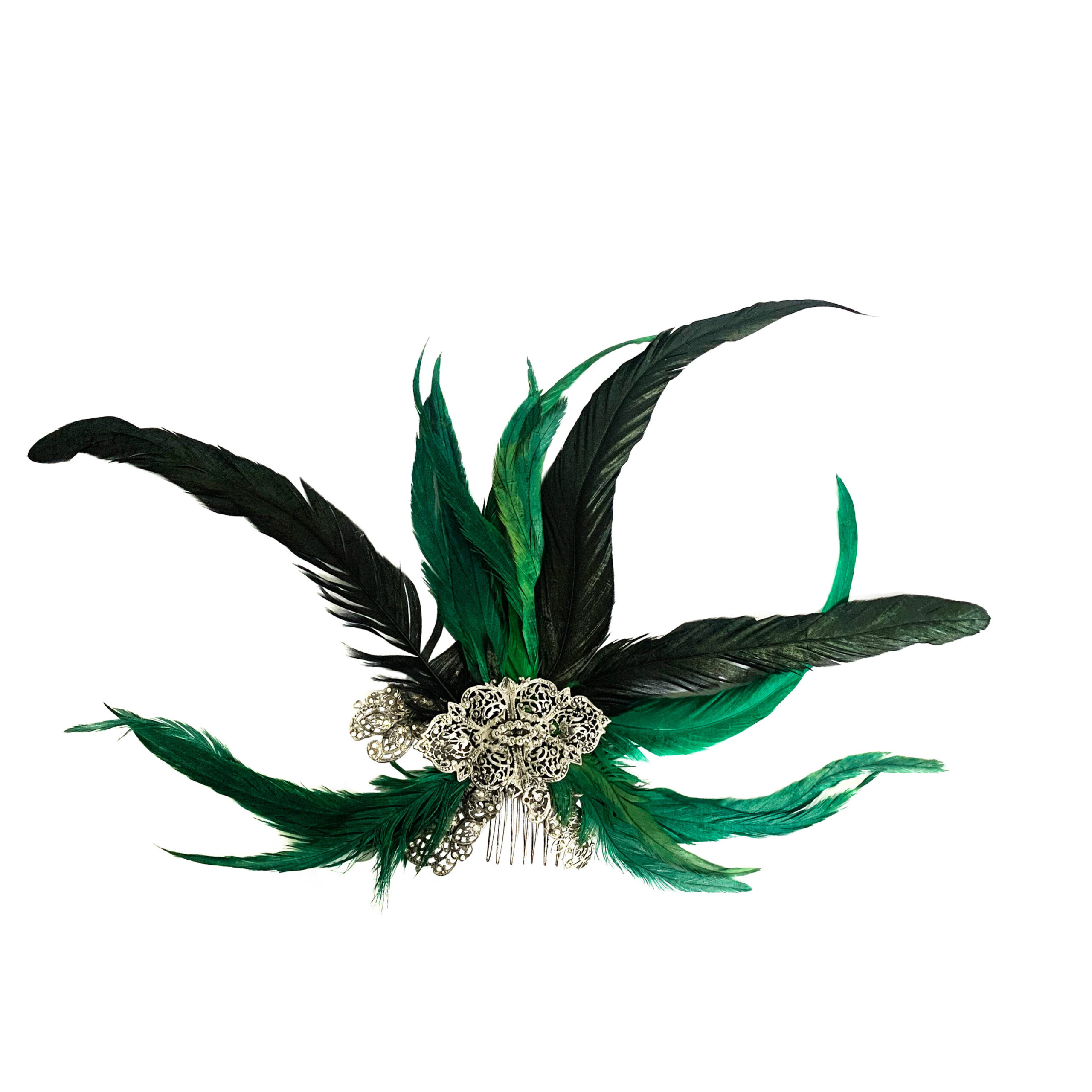 Pente com marcassitas, penas verdes e pretas – tamanho único